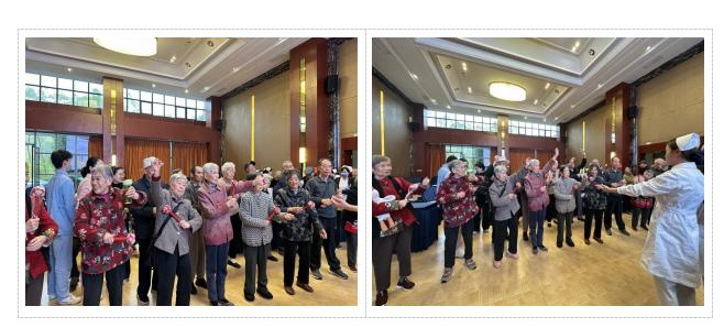 随后的互动环节温情洋溢。在护理人员的专业示范与温情引导下,老人们学习了“奥塔戈运动”和“拍八虚”健康操。现场气氛其乐融融,老人们在韵律与互动中感受着关怀与快乐。